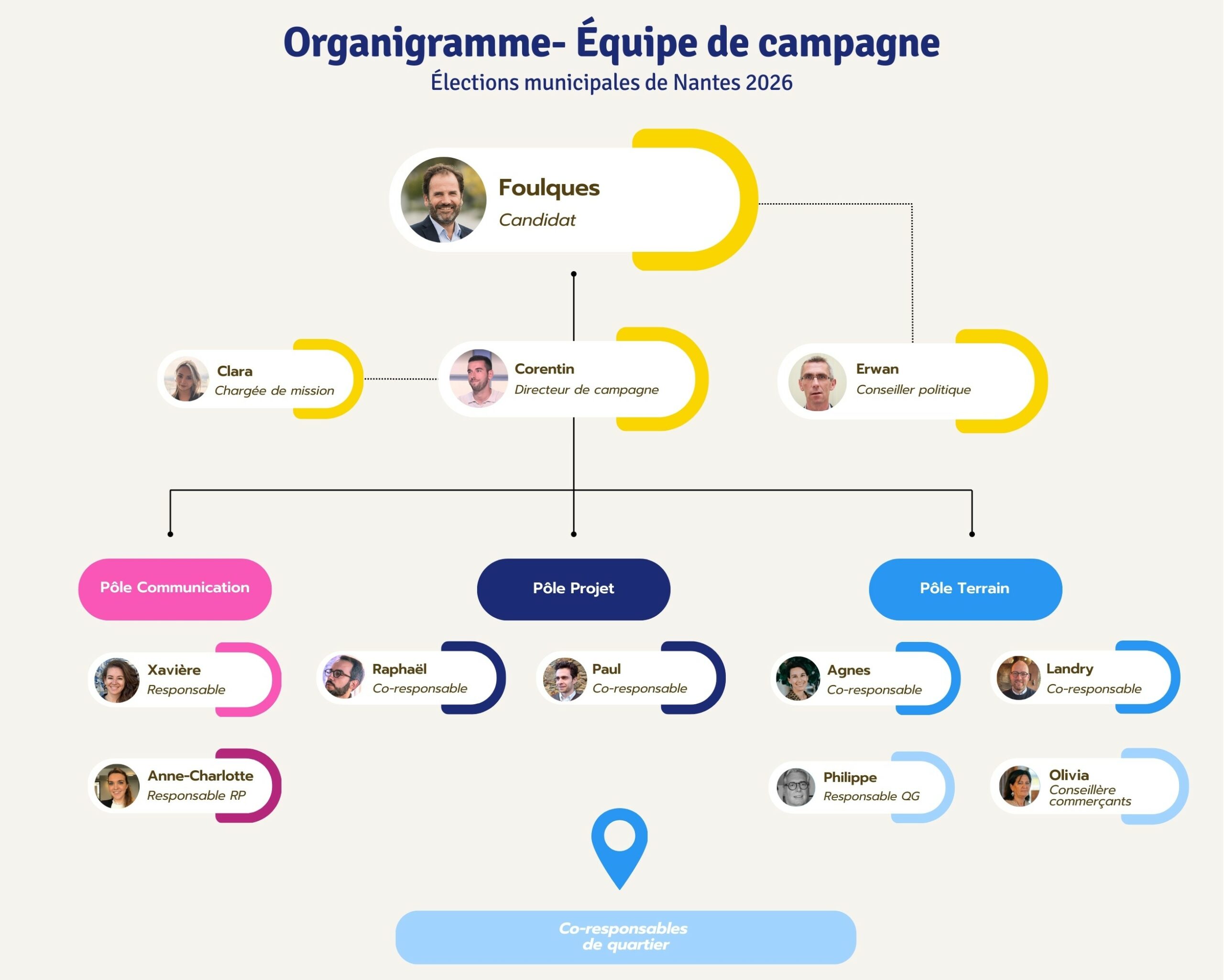L’organisation de la campagne s’appuie sur plusieurs pôles complémentaires – communication, projet, terrain, afin d’assurer une action efficace, coordonnée et proche des habitants.